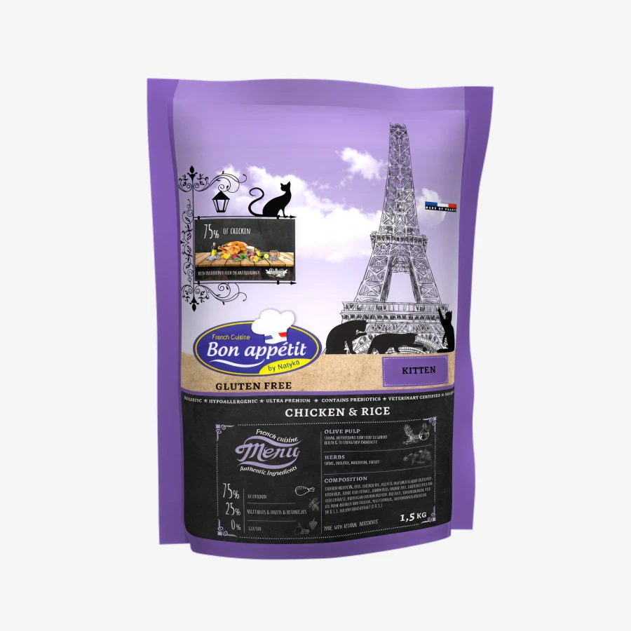Для котят, беременных и кормящих кошек, высокое содержание белка (38%) и жира (21%) для активного роста, куриное мясо 65% как основной источник, богат Омега-3 и Омега-6, пребиотики (FOS, MOS), высокое содержание таурина (5000 мг/кг), поддержка иммунитета